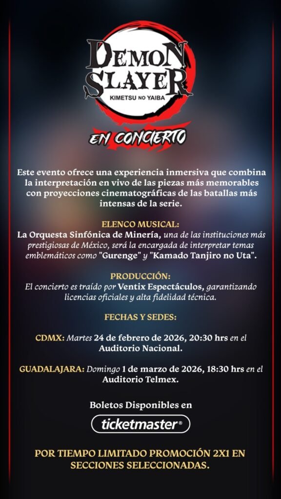 Una extraordinaria serie de conciertos basados en una de las franquicias de anime y manga japonés más populares de todos los tiempos, llegará a México. Este evento está diseñado para sumergir a la audiencia en una celebración musical del cautivador mundo de Demon Slayer: Kimetsu no Yaiba, el cual cuenta con una inmensa una base de fans global y ha arrasado en todo el mundo.