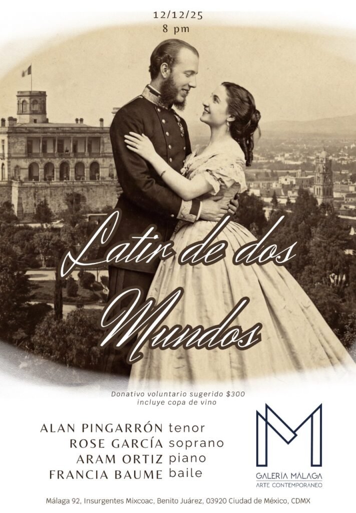 El próximo 12 de diciembre, se presenta Latir de Dos Mundos, un recital exclusivo de bel canto para promocionar su temporada de conciertos 2026 en la Galería Málaga Arte Contemporáneo. Los asistentes podrán disfrutar de un espectáculo inolvidable con música clásica en vivo y canciones icónicas como La Paloma. Este proyecto que surge de la mente de Rose García (soprano), evoca un tiempo posterior a la caída del Segundo Imperio Mexicano, donde en algún lugar de Europa, Carlota de Bélgica revive experiencias imaginarias con su querido Maximiliano de Habsburgo; siente sus manos, habla y canta con él en el interior de algún palacio donde su cordura la abandonará lentamente pero el recuerdo de su amado nunca. El recital se desenvuelve en 15 melodías cantadas en español, alemán, francés e italiano, que acompañadas al piano, narran el diálogo interno de la mente de Carlota con frases, movimientos musicales y danzas alrededor de la antes emperatriz.