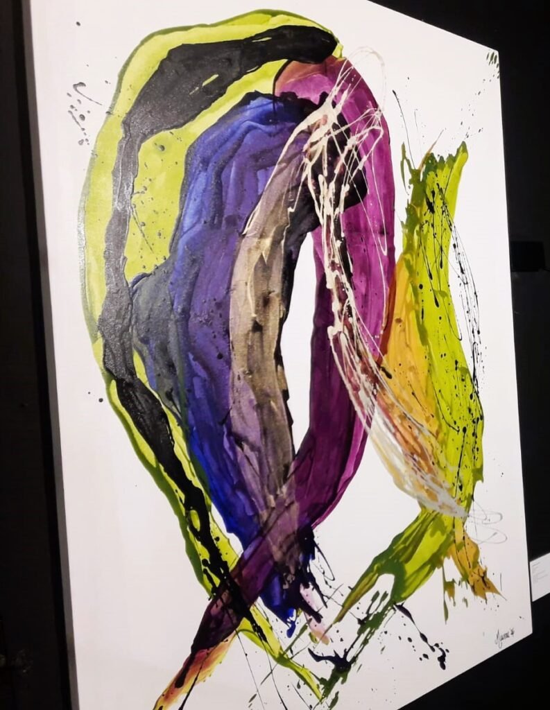 Su trabajo se sitúa dentro de la abstracción gestual, pero sin dramatismo ni exageración. Pintar para Mainou es una acción física y atenta: el trazo puede ser fuerte o amplio, pero siempre existe control y cuidado. Las capas superpuestas revelan procesos emocionales y estados internos —expansión, celebración, memoria— que se manifiestan como campos de energía donde el color construye espacio y pulso.